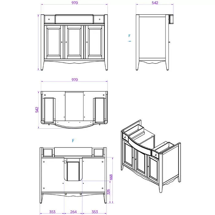 TW Veronica Nuovo комплект мебели с 2-мя выдвижными ящиками и 3-мя дверцами, с доводчиками Blum, ручки: бронза, 105см, напольный, цвет: белый