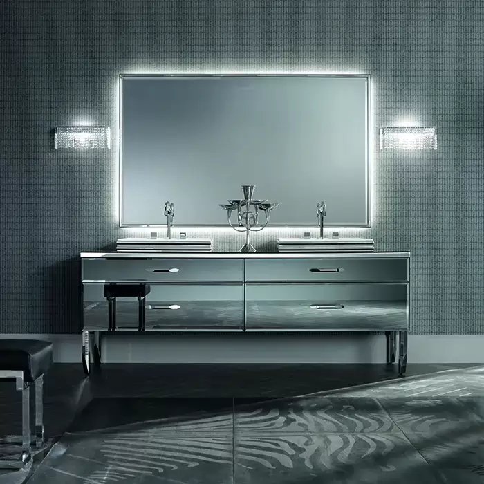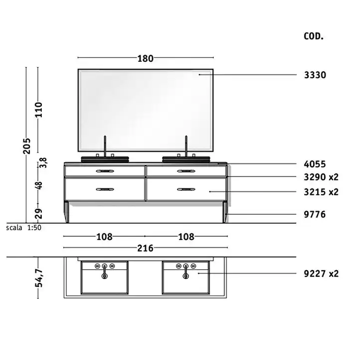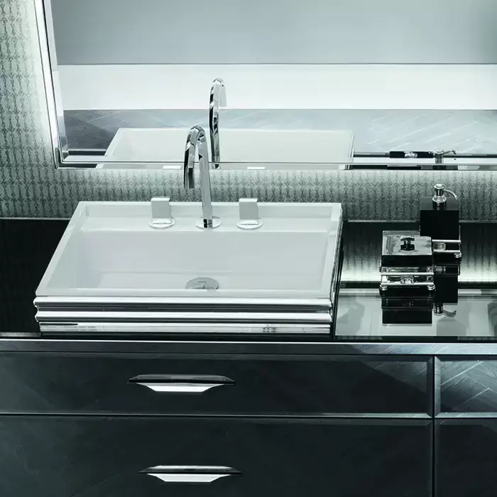 VITAGE milldue edition HILTON Комплект мебели с тумбой под раковину, раковиной ZURIGO63, зеркалом ZURIGO, 216 см, напольный, цвет: Fumè/сталь
