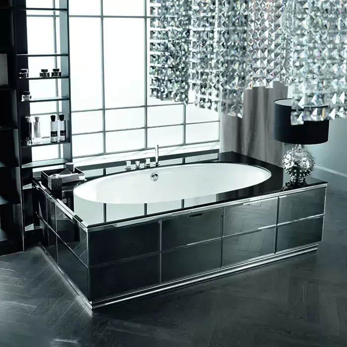 VITAGE milldue edition Ванна 190х100см, стальная, подача воды из водослива, в комплекте с сифоном, основанием и зеркальным топом, отдельностоящая, цвет: белый/Fumè